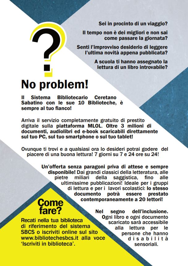 Tra le prime attività realizzate l’attivazione del prestito bibliotecario digitale sulla piattaforma MediaLibrary On Line ( MLOL ) per tutte le biblioteche del Sistema Bibliotecario Ceretano Sabatino.