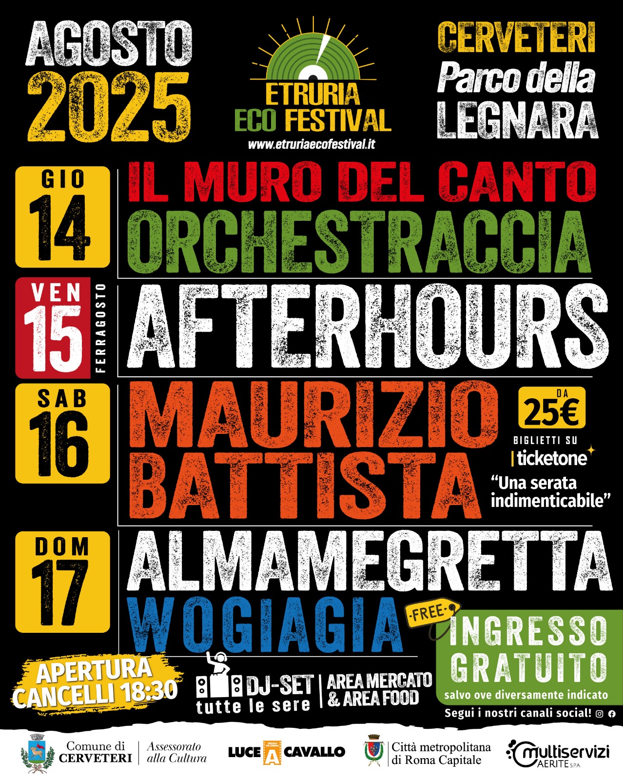 “Da 19anni è uno dei simboli dell’Estate di Cerveteri. Torna l’Etruria Eco Festival: da giovedì 14 a domenica 17 agosto al Parco della Legnara quattro serate straordinarie, tra musica e comicità. Un cartellone straordinario: apre l’Orchestraccia, poi il rock alternative degli Afterhours nella serata di Ferragosto, capitanati da Manuel Agnelli, Maurizio Battista, mattatore della comicità romana con uno show nuovo di zecca e con tanti ospiti e infine, gli Almamegretta. Vi aspettiamo tutti ad Etruria Eco Festival per un’estate davvero straordinaria!”. Ad annunciarlo è Elena Gubetti, Sindaco di Cerveteri.