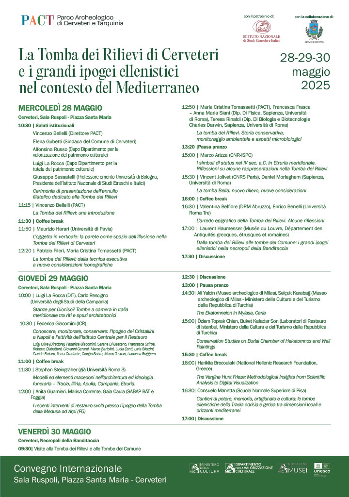 Nelle giornate del 28, 29 e 30 maggio si svolgerà a Cerveteri (Rm), nella Sala Ruspoli dell’omonimo Palazzo sito in Piazza S. Maria, di fronte al Museo archeologico nazionale Cerite, il Convegno internazionale La Tomba dei Rilievi di Cerveteri e i grandi ipogei ellenistici nel contesto del Mediterraneo. L’evento scientifico, che gode del patrocinio dell’Istituto nazionale di Studi Etruschi e Italici, è promosso e organizzato dal Parco archeologico di Cerveteri e Tarquinia (PACT), in collaborazione con il Comune di Cerveteri..
